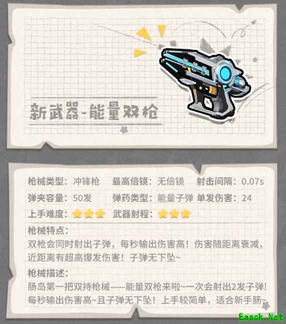 《香肠派对》能量双枪介绍肠肠们使用能量双枪时,一次会射出2发子弹~所以每秒输出伤害高!伤害有距离衰减,近距离有超高爆发伤害! 射击时子弹没有下坠,比较适合新手肠肠进行使用~