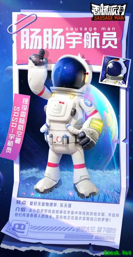 《香肠派对》ss9新皮肤肠肠宇航员肠肠宇航员 “长大了我要当个太空肠!” 为了实现自己的梦想,肠肠宇航员从没有放弃天体物理学的功课, 乐天派的他认为自己总有一天能够在宇宙中留下自己的足迹。 而现在「宇宙漫游计划」已经启动, 还有那么多的星球需要传递快乐,真是任重而道远呀!