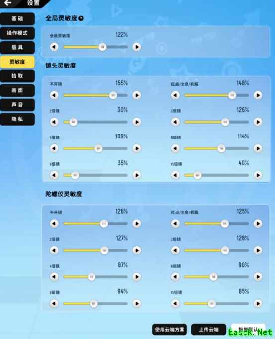 4.灵敏度 提供三种灵敏度调整全局灵敏度:可调节所有灵敏度数值(当需要同时调整所有灵敏度时使用) 镜头灵敏度:调节划屏视角操作灵敏 陀螺仪灵敏度:调节体感视角操控灵敏 *此项设置可保存云端,更改设置或更换设备后设置数据可从云端同步到本地和新设备。