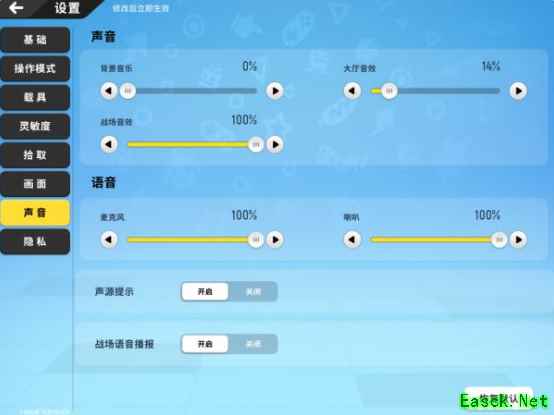 7.声音 背景音乐/大厅音效:喜欢安静的小伙伴可以调低或关闭 战场音效:这项一定要开到最大,可以及时获得附近声音信息(先于声源提示标) 语音:团队语音的输出/接收,根据实际的效果和队友沟通调整 声源提示:建议开启,附近声音会以标记的形式体现在画面上 战场语音播报:建议开启,能够及时获取对战重要信息