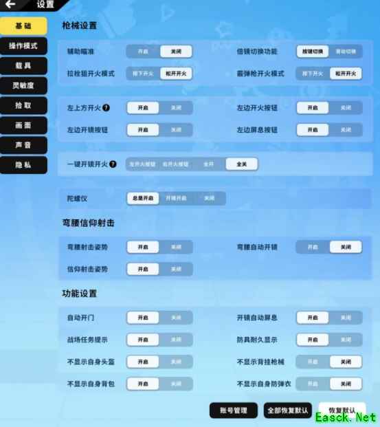 枪械使用习惯设置,陀螺仪开关,弯腰信仰射击细节设置,各类功能性设置开关 2.操作模式