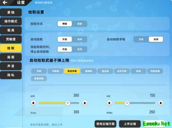 5.拾取 拾取习惯设置 自动拾取各类物资数量设置(达到设置数值,将不再自动拾取该物品) *此项设置可保存云端,更改设置或更换设备后设置数据可从云端同步到本地和新设备。