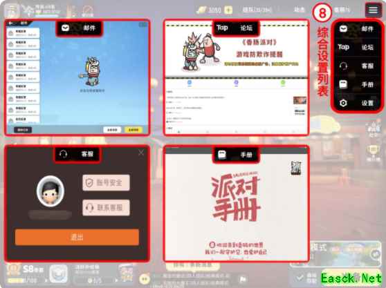 ·邮件 接受官方发送的各类邮件(举报/处罚反馈,活动奖励发放,各类官方公告通知) ·Tap论坛 游戏内置《香肠派对》Tap论坛 ·客服 客服项可调整账号安全相关设置(手机/邮箱绑定等) 也可以通过在线客服或者提交工单的形式,反映BUG,提交意见,违规举报,账号解封等问题。 退出当前登录账户。 ·手册 派对手册以简约可爱的漫画形式提醒玩家合规游戏,健康游戏,安全游戏。 2.设置