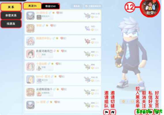关系列表可以查看已关注和关注自己的玩家,右下角小按钮可以对玩家进行相关操作。 亲密关系与个人主页内相同。 找朋友内可通过二维码/信息分享/ID昵称/最近匹配添加好友。 十三、排行榜
