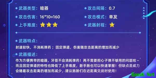 答:是香肠派对中第一把暗器。 香肠派对武器牙签介绍 1、暗器会占用第三号武器位,使用暗器不会消耗弹药。 2、使用暗器攻击时,暗器会短暂停留在被攻击的人身上。