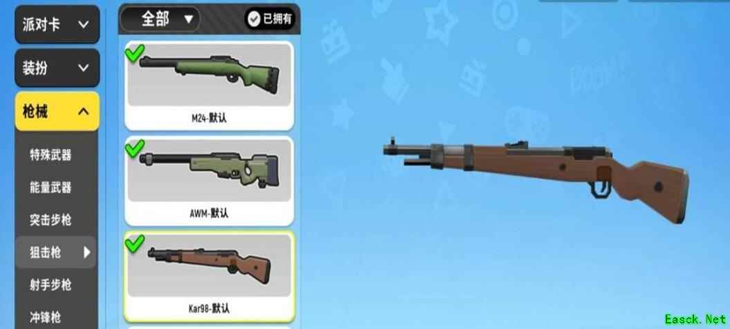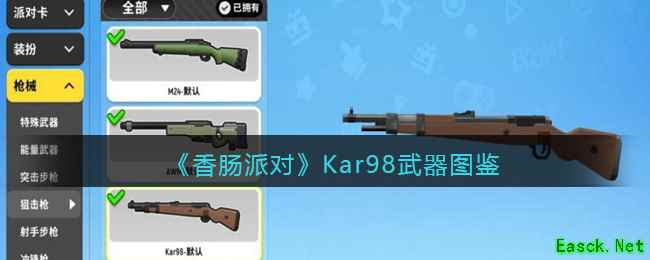 香肠派对中Kar98也就是大家常说的98k,Kar98与M24和AWM相比伤害等略显不足,子弹下坠是Kar98的一大弱点,在实战中非常考验玩家对这把枪弹道的把握,否则Kar98的子弹很难对敌人造成有效伤害,但是相对来说这把枪在游戏中有着极高的刷新率。接下来小编就给大家带来了《香肠派对》Kar98武器图鉴,想要了解武器详情的朋友速来!