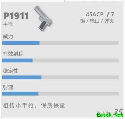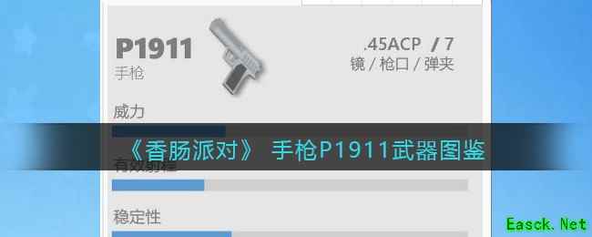 《香肠派对》中手枪P1911使用的是.45毫米子弹,在游戏在子弹重量为0.5。P1911并没有独自作战的能力,主要作用是在贴脸情况下主武器子弹打完后,使用P1911弥补伤害。接下来小编就给大家带来了《香肠派对》 手枪P1911武器图鉴,想要了解武器详情的朋友速来!