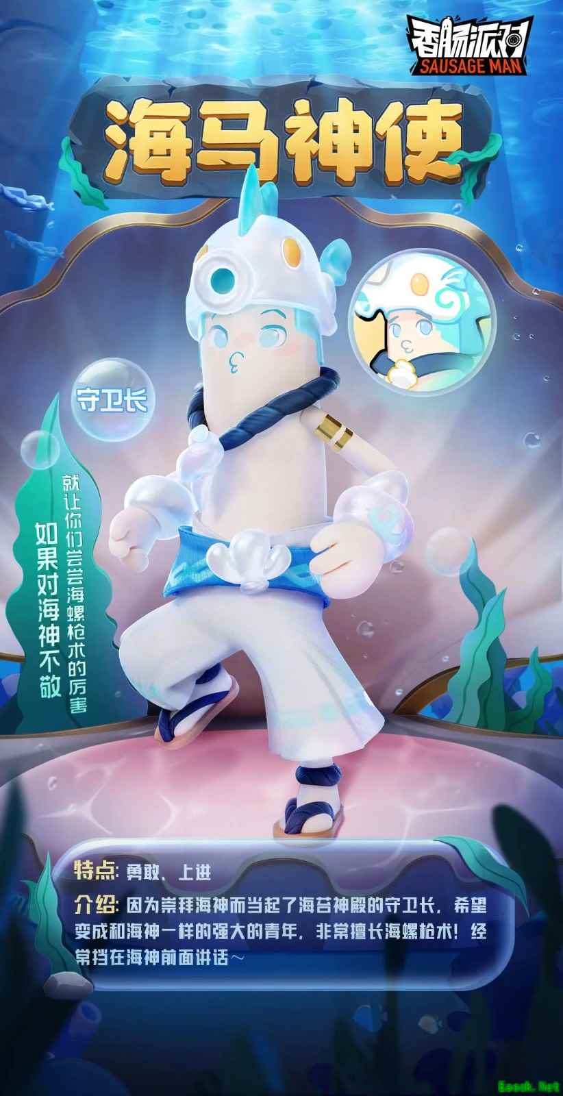 香肠派对是一款生存射击吃鸡类手游,游戏在SS10赛季中推出了许多的新皮肤套装,海马神使就是其中之一,香肠派对海马神使特点是勇敢、上进,因为崇拜海神而当起了海苔神殿的守卫长,希望变成和海神一样的强大的青年,非常擅长海螺枪术!经常挡在海神前面讲话。