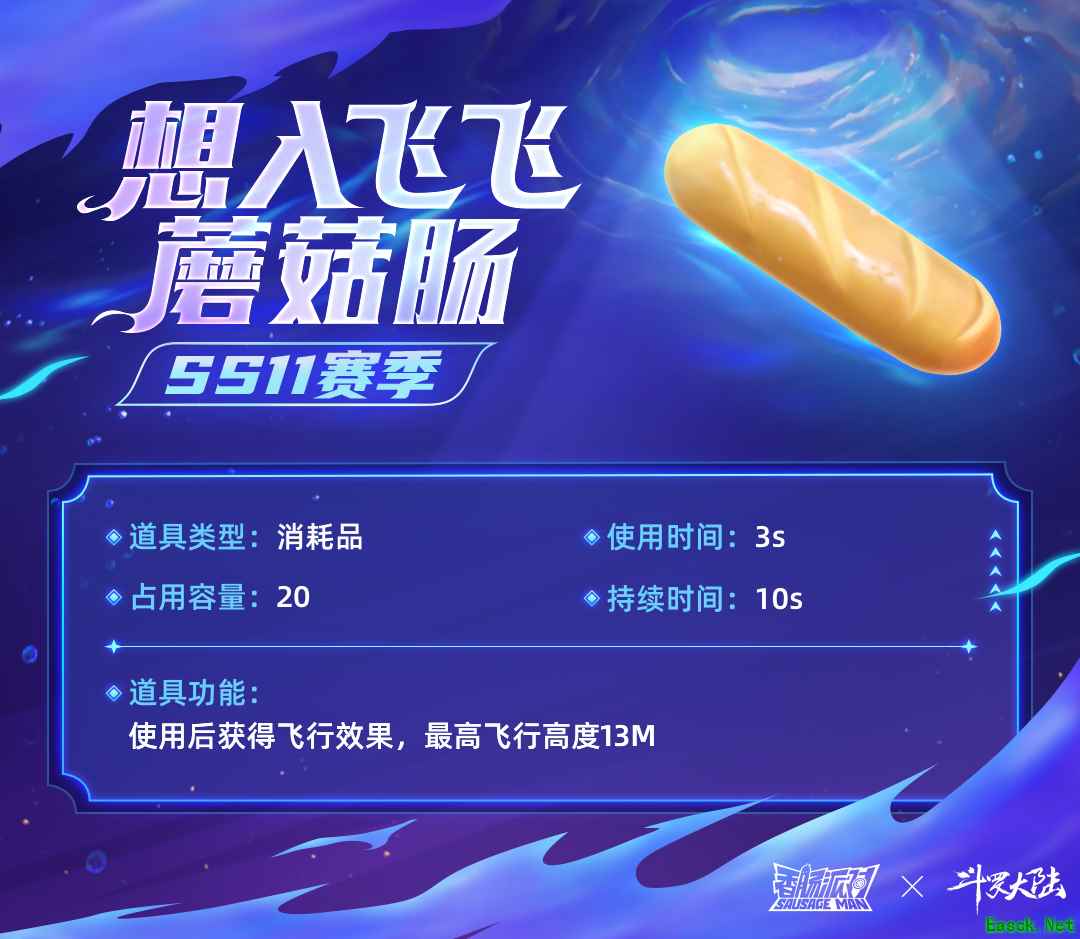 《香肠派对》SS11想入飞飞蘑菇肠道具作用爆料【想入飞飞蘑菇肠】 >>道具展示 能够飞翔的肠肠它来啦!只要吃掉「想入飞飞蘑菇肠」就能长出炫酷的双翼自由翱翔在高空中~