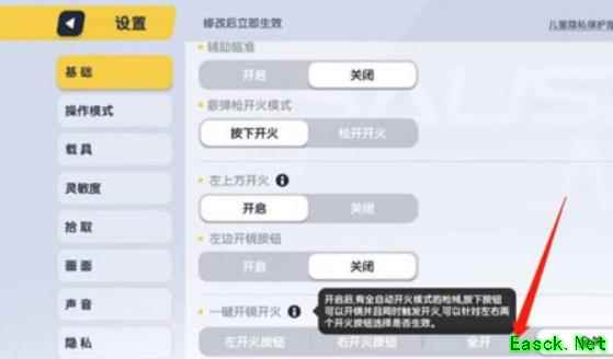 3、进入设置页面,点击左侧的“基础”,找到“一键开镜开火”,点击“全开”即可