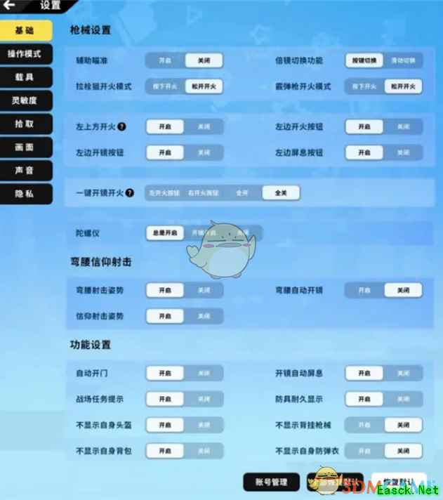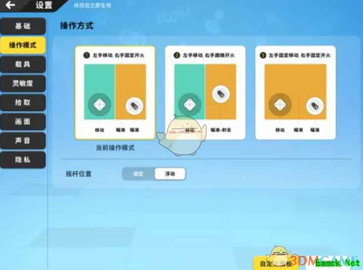 调整枪械使用习惯、陀螺仪开关、弯腰射击等功能设置。 2、操作模式: