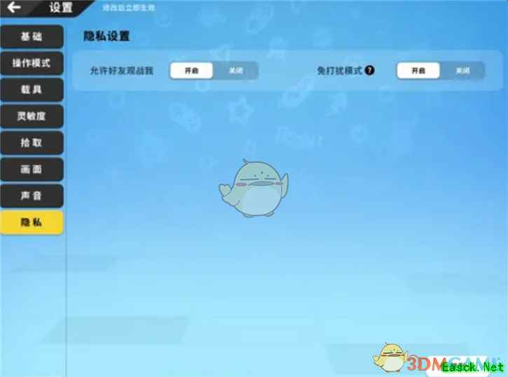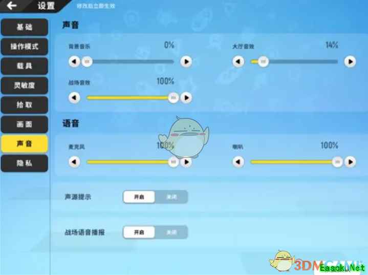 调整背景音乐和战场音效,建议开启战场音效和声源提示,增强战斗感知。 8、隐私: