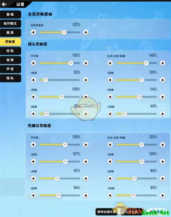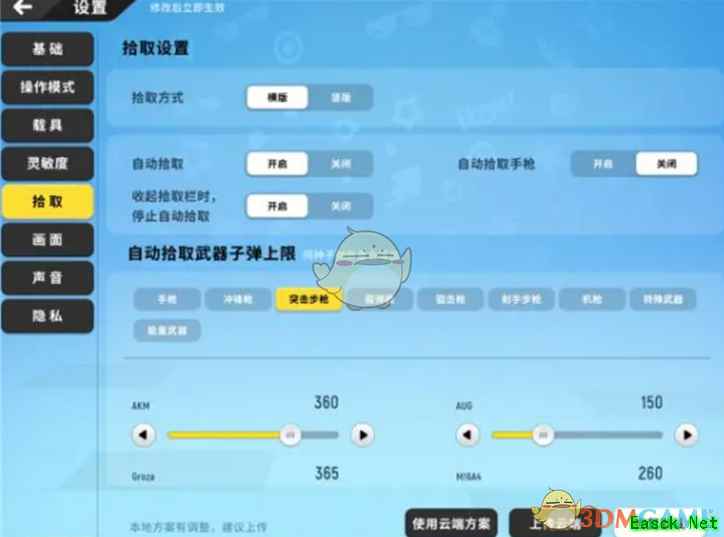 调整全局灵敏度、镜头灵敏度和陀螺仪灵敏度,支持云端同步。 5、拾取: