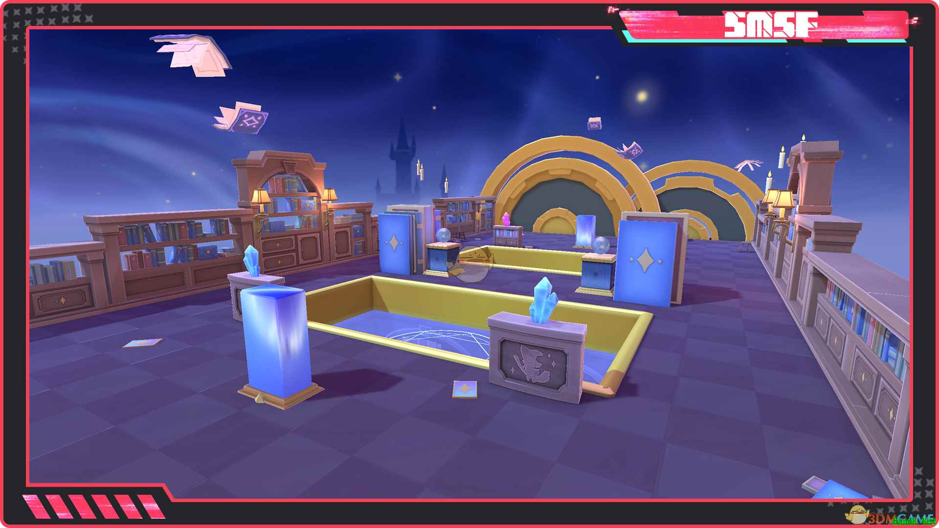 6、地图-图书馆 奇幻的魔法学院也成为了对决地点之一,天空中飞行的魔法书为对决增添了几分奇幻!不同的魔法装饰也将带来独特体验~在充满魔法气息的图书馆中,开启一场梦幻对决吧!