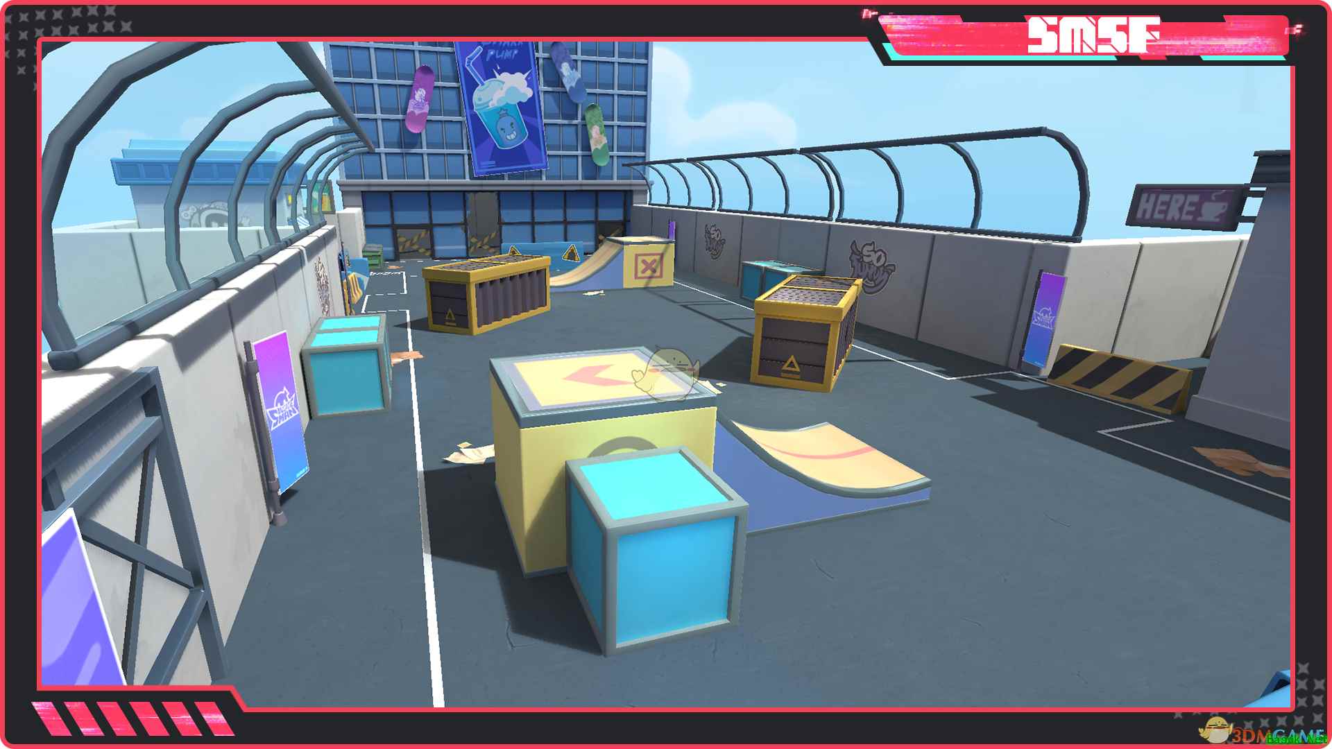 8、地图-滑板公园 接下来要介绍的地图是滑板公园!这里是喜欢滑板运动的肠肠们的聚集地,肠肠可以通过斜坡登上高处占据较高视角从而取得先机。