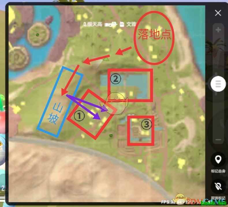 2、先跳推荐的落地点搜索物资,整备完毕后利用山坡充当障碍物摸到①号房区后面的山坡制高点(如上图红色箭头)利用高打低优势解决①号房区敌人并占领。