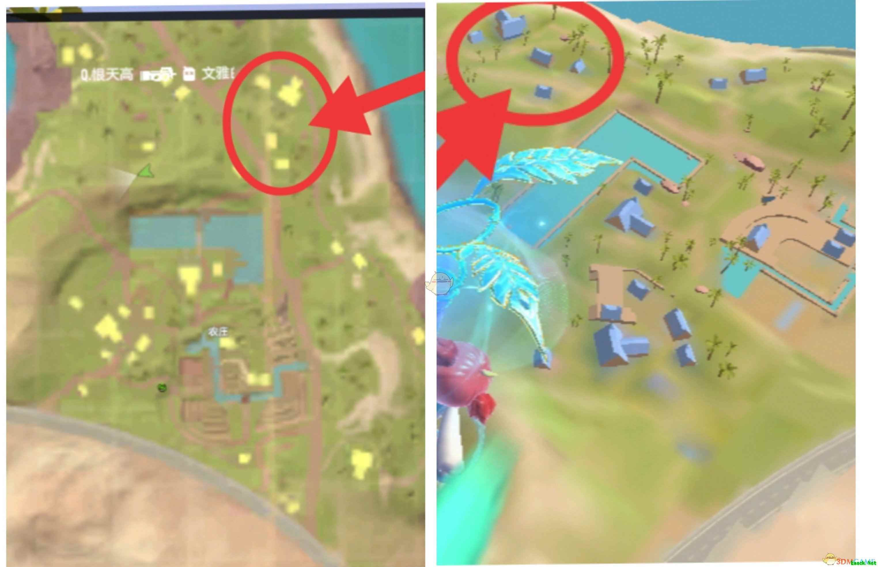 二、推荐落地点 选择跳到农庄水池附近的野点房屋,这个位置能避免农庄人多时落地无枪被淘态的悲剧,同时周围会刷新车辆,人多时可以快速撤离。(位置如下图)