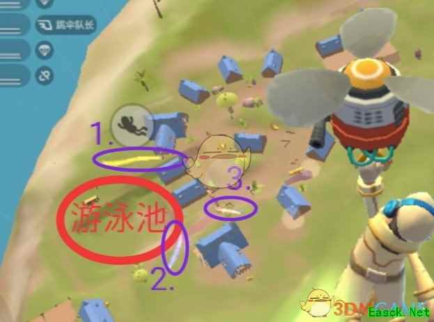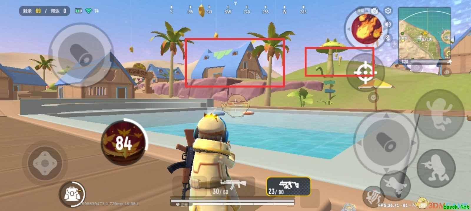 2、此资源点有处泳池,泳池旁有宝箱刷新及泳池周围房屋分布较密集(这些地方跳的人相对多些) 3、可以选择跳伞到靠近马路旁的房屋,可以与敌人保持距离,避免落地贴脸。