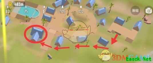 三、狙击点推荐 1、进攻路线/占领最高点如下图。 2、搜完物资后可以选择从左侧房区进攻到泳池。利用房屋作为掩体,最好不要暴露自身位置,偷偷摸摸占领左侧房区最高楼。如图红圈标记。