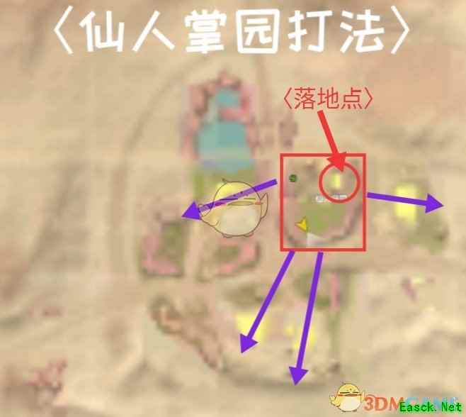 1、仙人掌园推荐落地点 ①、优先跳到(上图红框)这块岩石上面的一栋土砖房屋内进行搜刮,至少能捡把防身武器。 ②、跳伞的玩家不多,危险并不大。偶尔碰到一两名敌人。紫色箭头表示可观察到的地方。 ③、操作流程:(敌人一般不会跳这栋房屋,因为大多数都为选择周边的大型土砖房屋)这块岩石区域地势较高,易守难攻。能观察到周围的房屋(如上图紫色箭头代表可观察到的位置)