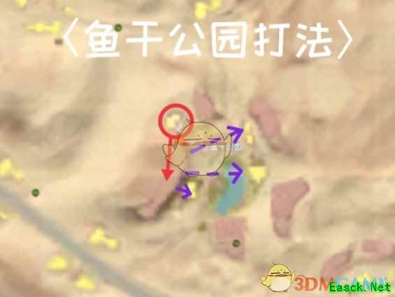 1、鱼干公园推荐落地点 跳到鱼干公园外围岩石旁边的土砖房屋里(如图“红圈标记”)由于这栋房屋比较偏离鱼干公园中心,一般敌人不会选择落点。 2、鱼干公园实战打法:占领岩石制高点 搜索装备完毕,立刻占领周围最高的岩石制高点(如图红色箭头指向)这块岩石地势较高,能清楚观察到下面鱼干公园每个房区和中央的水池。居高临下,纵览公园(如上图紫色箭头表示观察到的视野)在岩石上面进行高打低,能轻松架住敌人。作战优势极大!