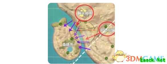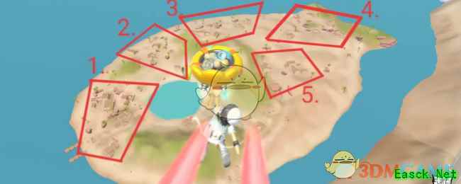 二、推荐落地点 鱼肠岛有着许多房区,房区都比较分散,大至可分为五个房区。优先跳到3号或5号房区,搜索完装备后抢占南边的小山坡(如下图)。