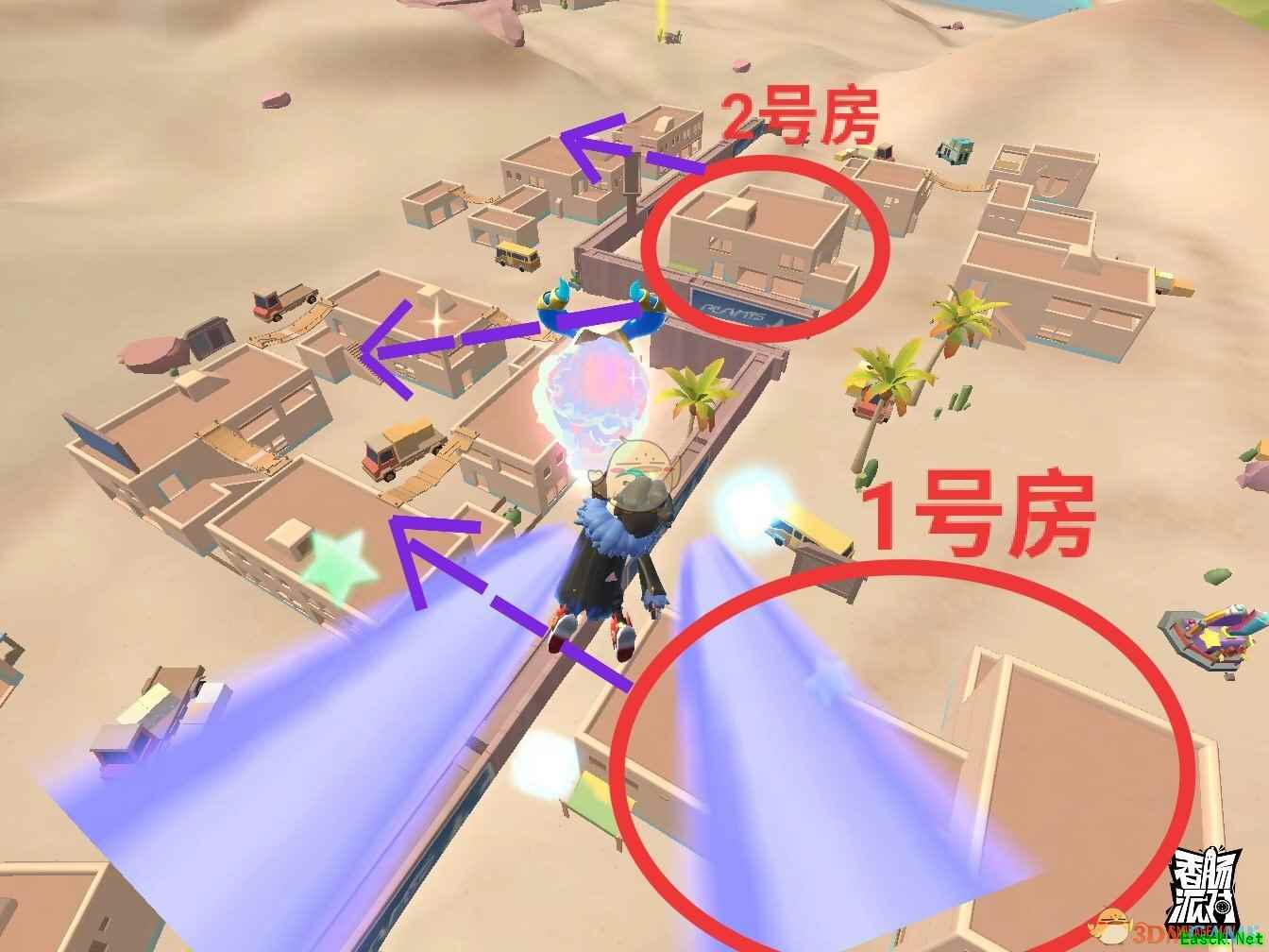 二、推荐落伞点 建议优先跳到高层房区里搜索物资发育,因为高层房区地势往往比底层房区要高些。 三、实战打法:分情况 1、在高层房区攻打底层房区 ①、搜索装备完毕后立刻抢先占领高层房区的这两栋土砖房(如下图红圈1号或2号房屋) ②、单排:独自一人建议去2号房屋,2号房屋顶端视野开阔,能轻松架住底层房区两边的房屋。 ③、而1号房屋顶端只能观察到一边房层,另一边属于视野盲区,看不见(如图,紫色箭头代表可观察到的视野)