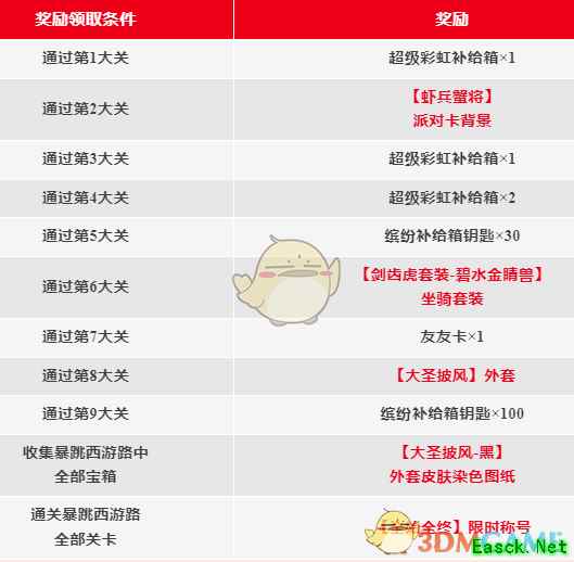 通关奖励: 当肠肠通过「暴跳西游路」中的大关后即可领取对应的通关奖励。 不仅可以获得超级彩虹补给箱,缤纷补给箱钥匙等奖励,还可以获得【大圣披风】外套等皮肤奖励!