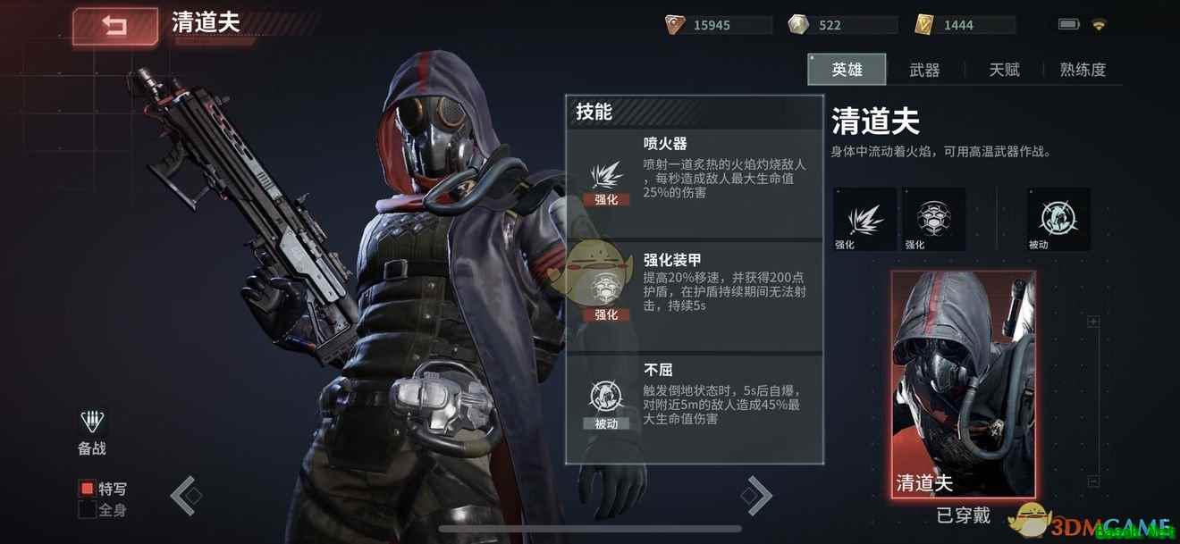 清道夫技能介绍一技能:喷火器。 每秒造成敌方25%生命值的伤害,这个技能绝对是清道夫的灵魂技能。