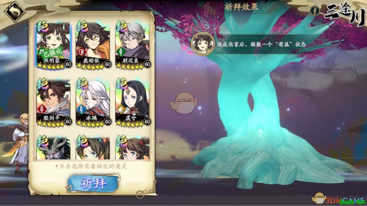 【玩法说明】 三途川包含不同类型的路点事件或者战斗关卡,挑战每个战斗关卡需要消耗10点体力。 1、「神树」:会给予英灵一个祝福增益,在本次三途川中有效,少侠可以根据自身阵容选择受祝福的英灵。