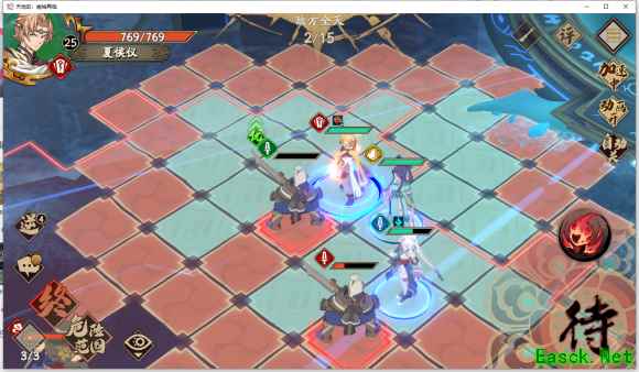7、第二回合开局是这么个情况。 8、能不能顺利三星过关,这一回合非常关键。 9、如果这一回合能跑到BOSS危险范围内,我们就有3和4两回合的时间去搞定两个BOSS,时间十分充裕。 10、但如果不能的话,第三回合我们才进入BOSS的危险范围,BOSS行动会开两个护卫,我们只有一个回合的时间消灭两个BOSS,以夏侯仪和冰璃的输出来说,几乎不可能。