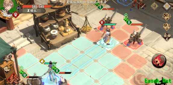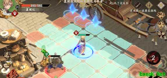 第二回合,夏侯仪灭掉一个小兵,注意,这时候夏侯仪不能放技能,普攻就行了。 封铃笙紧随其后,封铃笙唯一的作用就是帮夏侯仪挨揍,因为夏侯仪火属性,小兵雷属性,小兵不会优先攻击夏侯仪,如果没有封铃笙的话,小兵很有可能挡住夏侯仪的路。