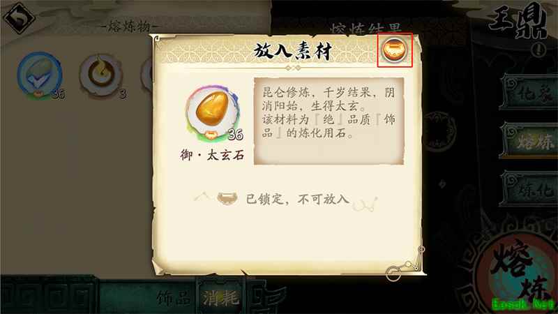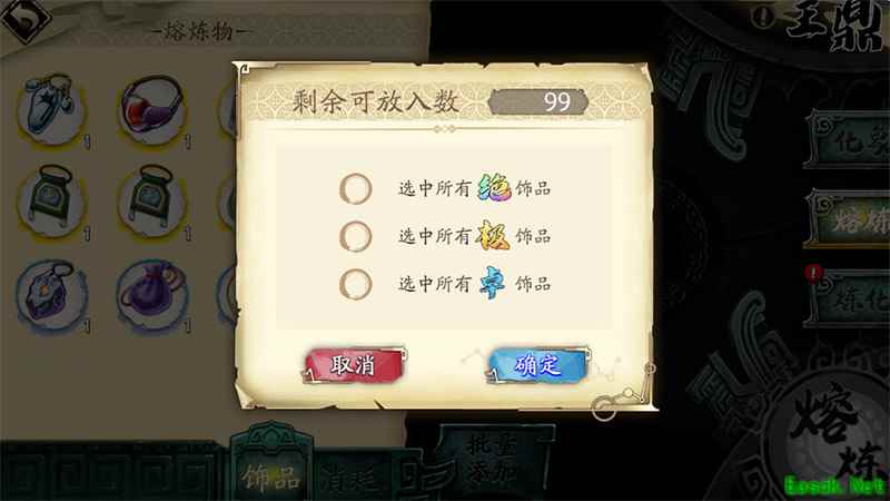 三、饰品熔炼 1、批量添加:点击右侧批量添加按钮,可直接选中稀有度(卓、极、绝)相同的所有饰品,上限为99。 2、奖励:熔炼卓品饰品可获得「铜钱」,熔炼绝品饰品可获得「泫露」,熔炼极品饰品可获得绝品「御-太玄石」。