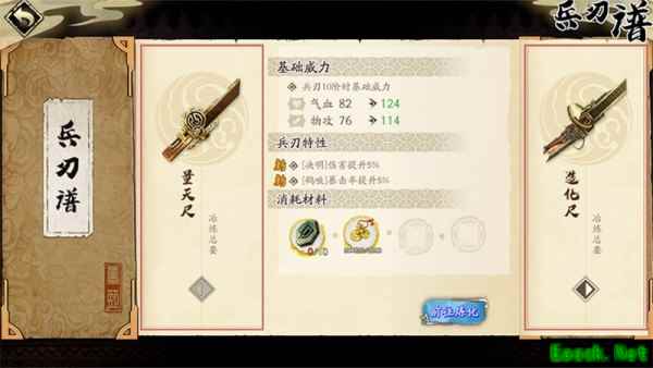 《天地劫手游》兵刃谱使用攻略兵刃系统-兵刃谱 队伍中的每一位英灵都可以配备一个兵刃出战,而兵刃的淬火和魂石镶嵌都可以大大提升英灵的战斗力和各项属性数值。 各位玩家在通关主线剧情第10幕【泉底寒冰】之后就可以解锁【兵刃谱】了。 在兵刃详情页面点击右上角的【兵刃谱】按钮可以进入系统界面。 兵刃炼化