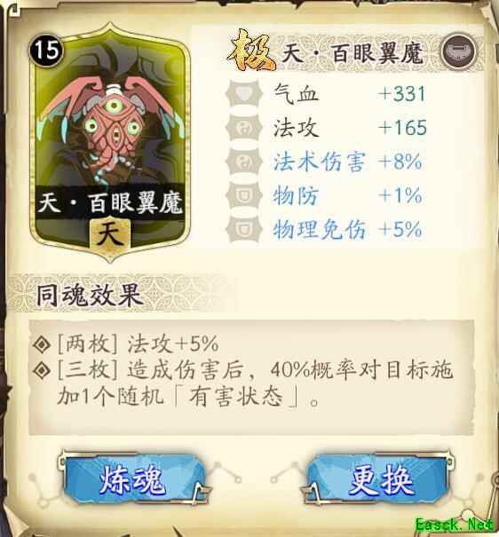 【白眼翼魔】——特点是3枚效果只要造成伤害就有几率给被攻击目标附加1个随机“有害状态”,群体伤害技能也能触发该效果。 适合封寒月在PVP中不但能造成减速破坏护卫还能多一个随机有害状态,增加对面祝由的驱散难度。 以上就是《天地劫:幽城再临》封寒月魂石搭配推荐的全部内容了,更多手游攻略请关注手游网! 本文内容来源于互联网,如有侵权请联系删除。 |