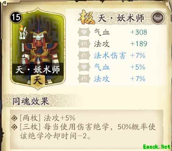 【妖术师】——2枚+5%法攻,3枚50%几率技能造成伤害时降低冷却2CD,正好让封寒月两个2CD的单体技能达到使用后就完全重置无CD,只要脸好就能一直用技能攻击。