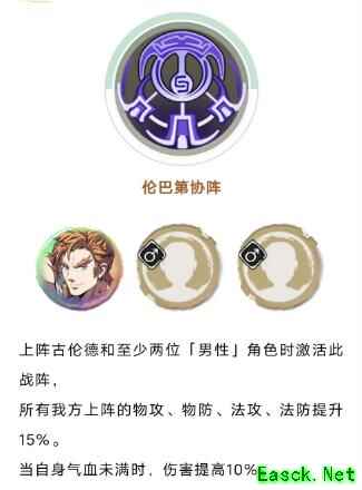 古伦德阵法,加成高,组成条件也不难,但特效鸡肋,但因为要求额外两名男性角色,所以比较微妙。