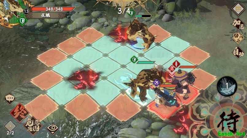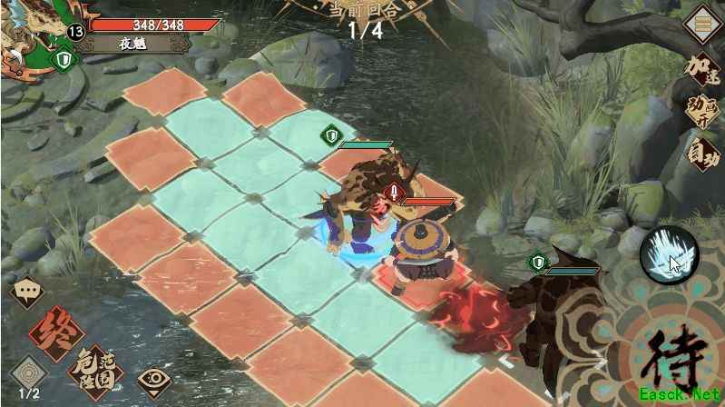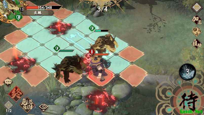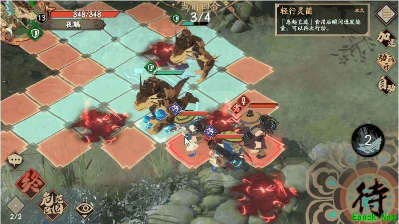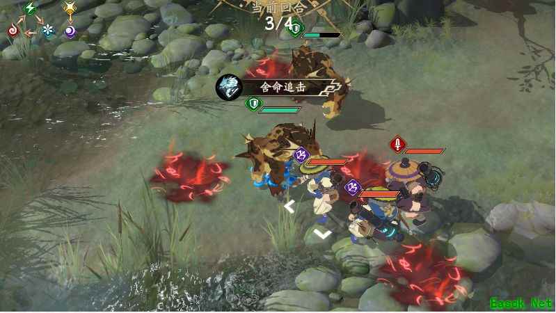 3、敌方行动,这时候左下角的侠客会过来打你第一只挡路的夜魑,但不会打死,直接反手技能给他拍陷阱上,卒。