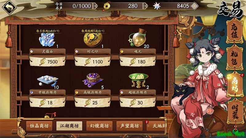 二、江湖商坊 在江湖商坊内可以通过名声购买历练丹等道具。可以通过天地阁帮会任务,山河志的协力任务或者组队等来获取名声。