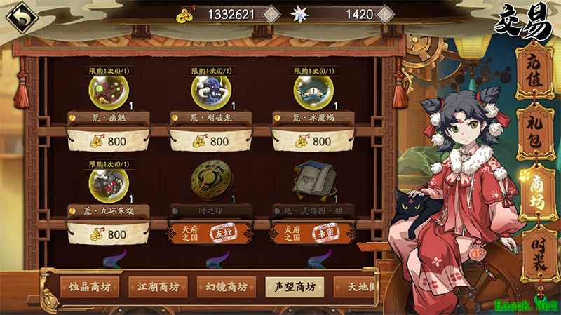 三、幻镜商坊 在幻镜商坊内购买兵刃升级的材料,以及高级魂石。要注意幻镜商坊内的商品均在一定周期内有购买次数的限制。可以通过挑战幻镜来获取幻镜重宝。