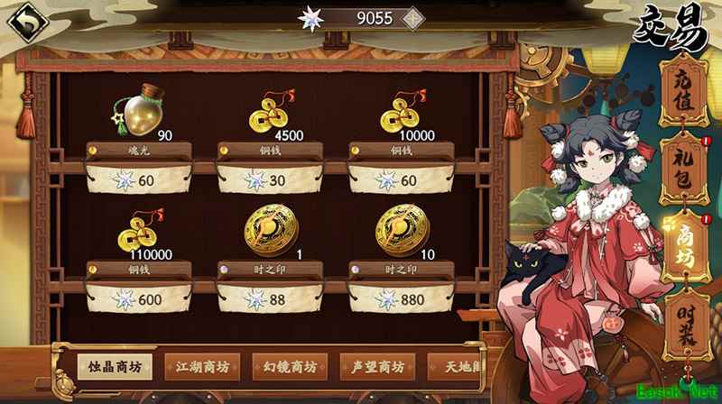 《天地劫:幽城再临》商店交易系统介绍一、蚀晶商坊 在蚀晶商坊内,可以通过蚀之晶购买铜钱,时之印还有魂光。