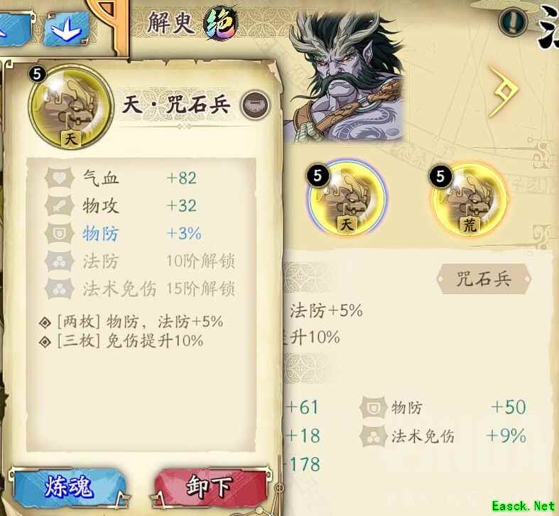 解臾的魂石推荐用咒石兵,2枚物防、法防各加5%, 3枚对所有伤害减伤增加10%。不错的减伤加成配合解臾的高防御、高血量可以发挥1+1大于2的效果。