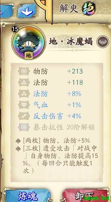 [冰魔蝎],2枚效果和咒石兵相同,3枚效果是遭受攻击对战中物防、法防各加15%, 虽然双防增加较多,但3枚的效果每回合只能触发1次,大大限制了在推图中一回合里反复挨打时发挥效果,更适合用在BOSS头目战中。 以上就是《天地劫:幽城再临》解臾魂石搭配推荐的全部内容了,更多手游攻略请关注手游网! 本文内容来源于互联网,如有侵权请联系删除。 |
