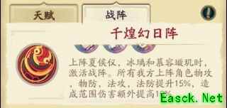夏侯仪有自己的战阵[千煌幻日阵],战阵的特效能额外提高10%范围技能伤害,再配合都是群体伤害技能为主的队友效果最好。当然此阵的最大缺点是需要3名指定的绝品英灵组成,收集难度较大,是属于后期的战阵。