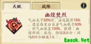 夏侯仪是生存能力较强的咒师,炎系单体技能和群体技能都同样出色,天赋能够在受到重创后瞬间回满血量并获得能力提升,而且还是游戏中为数不多能制造地形的英灵,在阵地战中作用突出。 二、天赋介绍