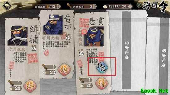 玩法介绍 1、玩家参加一次海捕令战斗需要消耗一份海捕令战斗以及20点体力。 2、在玩家解锁海捕令玩法后,玩家可以在历练中的每日任务里得到海捕文书。 3、海捕令有着八个位阶,玩家可以在不同等级解锁不同位阶的海捕令关卡。 4、玩家在每次战斗的时候击退的贼寇越多,那么得到的铜钱数量也就会越多。