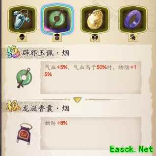 六、饰品推荐 解臾的最佳饰品,目前发现的有盔甲上的绝品的[辟邪玉佩·烟]——不但加5%气血,在血量高于50%的时候物防+15%高额加成。