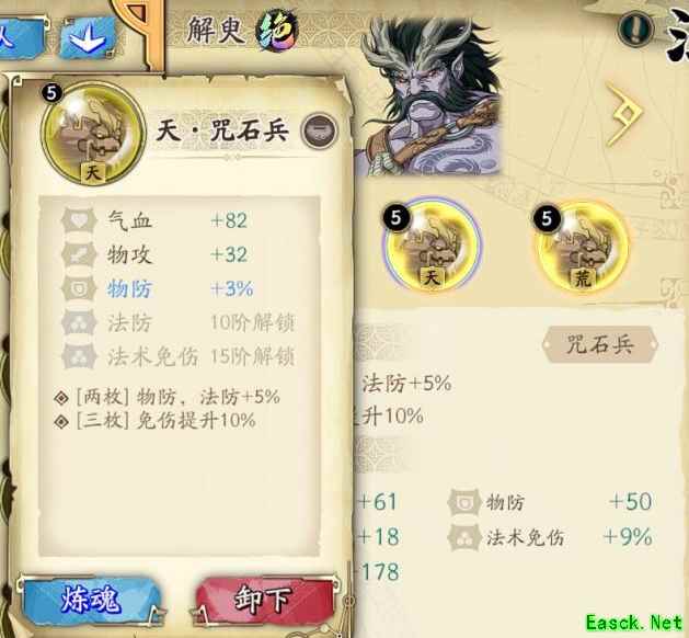 [破阵威压]可以晕住对面高伤害输出使之不能反击,好方便我方安全集火,或者施加给对面T使护卫能力失效,还能晕住带[闪避]对象造成[闪避]失效。[龙焰化鳞]可以更好的避免被对面冰璃这种可以一回合连续攻击高爆发物理单点秒杀。 五、魂石推荐 解臾的魂石推荐用咒石兵,2枚物防、法防各加5%,3枚对所有伤害减伤增加10%。不错的减伤加成配合解臾的高防御、高血量可以发挥1+1大于2的效果。