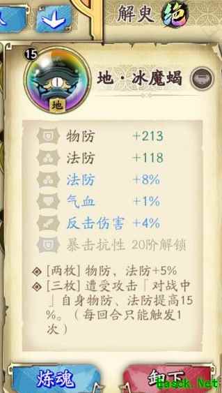 [冰魔蝎],2枚效果和咒石兵相同,3枚效果是遭受攻击对战中物防、法防各加15%,虽然双防增加较多,但3枚的效果每回合只能触发1次,大大限制了在推图中一回合里反复挨打时发挥效果,更适合用在BOSS头目战中。
