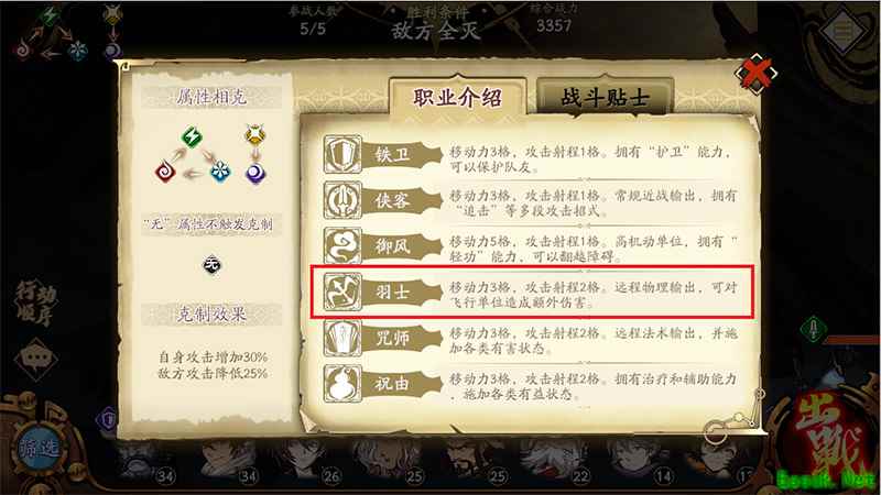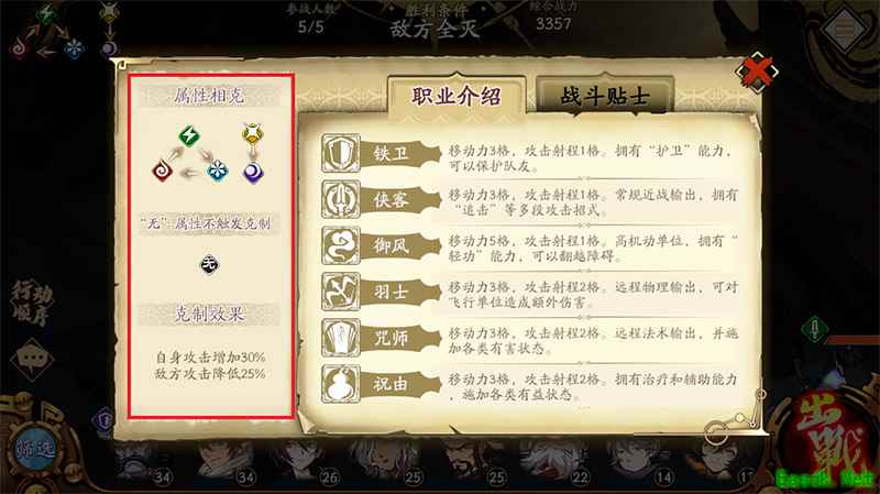 二、职业克制 相比属性克制,天地劫战斗中的职业克制并没有那么多。 其中羽士会对所有飞行单位克制且造成额外伤害。 而咒师以及祝由的近身攻击(相邻一格范围内)会被敌方角色先攻。